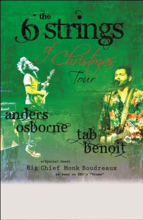 Saturday night you can do Christmas New Orleans style with The Six Strings of Christmas Tour featuring Tab Benoit and Anders Osborne (not one of Ozzy's Osbornes) with special guest Big Chief Monk Boudreaux. They'll be at the Hat Factory with doors opening at 6:30 PM and the show starting at 7 PM. Tix are $16 for GA and $24 for Reserved seats. Tab and Anders both play New Orleans roots based rock and roll. I used to go see Anders quite a lot in the 90's then he seemed to stop touring the Northeast for a while so I haven't seen him in a long time. But he always put on a great show and I might have to make it out for this one. Here is Anders rockin' out with the Stanton Moore Trio in Baltimore in September: